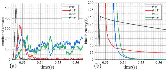 DEM simulation statistical results of the particle system under different baffle angle conditions. (a) changes in particle contact number; (b) changes in kinetic energy of the system.