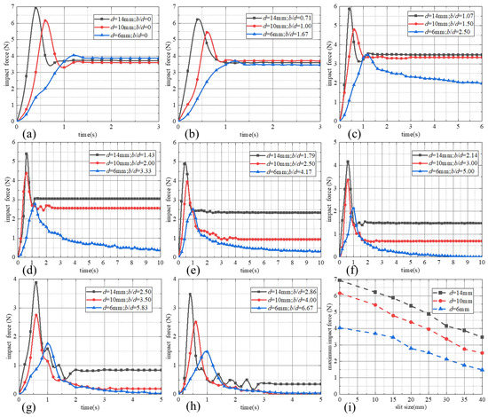 Variation of particle impact force with time in the flume experiment when θ = 45°. (a) b = 0 mm; (b) b = 10 mm; (c) b = 15 mm; (d) b = 20 mm; (e) b = 25 mm; (f) b = 30 mm; (g) b = 35 mm; (h) b = 40 mm; (i) summary of maximum impact forces for different slit widths. All impact force time history curves were recorded from the moment the particles first contacted the baffle structure.