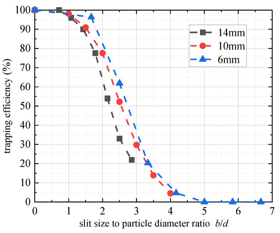 Particle trapping efficiency of inclined baffle structure with θ = 45° under different slit widths.