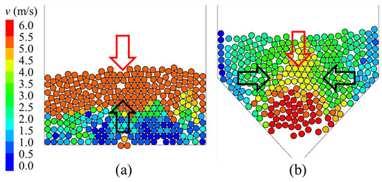 As can be seen from reference [27], when other conditions are the same, impact velocity determines the impact force of particles on the baffle structure so enhancing the kinetic energy dissipation of particles is the key to weakening the impact effect. The DEM simulation results of Figure 3 and Figure 4b indicate that under the same particle properties and baffle projected area, the baffle structure has a better particle kinetic energy dissipation effect when θ ≠ 0°, and the kinetic energy dissipation efficiency will be higher for larger angle (θ ≥ 30°) baffles than the smaller angle (15°) one. This may be due to the different rebounding forms of the particles. As in Figure 8, the red arrows represent some of the particles that did not collide with the baffle structure, and the black arrows represent the particles that collided with and bounced back from the baffle structure. When θ = 0°, after the particles in the lower part of the particle swarm collide with the baffle, they only collide with the upper part of the particle swarm in the direction of motion to dissipate the kinetic energy of the particle system. However, when θ ≥ 0°, the particles on both sides of the particle swarm first collide with the baffle and bounce to the middle and then collide with the particles in the middle of the particle swarm in three directions to dissipate the kinetic energy. According to the law of conservation of momentum, in the baffle with θ = 0°, there is a big difference in the velocities of the two parts of the colliding particles, and the particle momentum cannot be canceled. Therefore, after the collision, the upper particles rebound and diffuse, while, in the baffle with θ > 0°, particles bouncing towards the middle after the collision have almost the same velocity. After the collision, the momentum of particles offsets, and then the particles accumulate in the baffle structure. This concludes that the inclined baffle structure has more advantages in consuming particle kinetic energy than the transverse baffle structure. However, when the baffle angle is small, the main particle collisions still occur in the flow direction other than in the transverse direction; momentum is easier to occur in the flow direction as well, which is why the decrease in the kinetic energies of the particle swarm with a smaller baffle angle was less than that with a larger baffle angle. Therefore, increasing the baffle angle increases the number of collisions between particles. In addition, by increasing the number of collisions between particles, a stronger kinetic energy dissipation effect can be achieved. Herein, it was found that θ = 45° is a relatively suitable angle to reduce the impact of particles.
