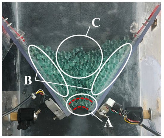 Schematic diagram of particles jamming in the inclined baffle structure, in which the white circle is the divided particles that have different effects on jamming, and the red dotted line is the arch structure formed by the particles at the opening. (A) is the arch forming area; (B) is the extrusion area; (C) is the impact area.