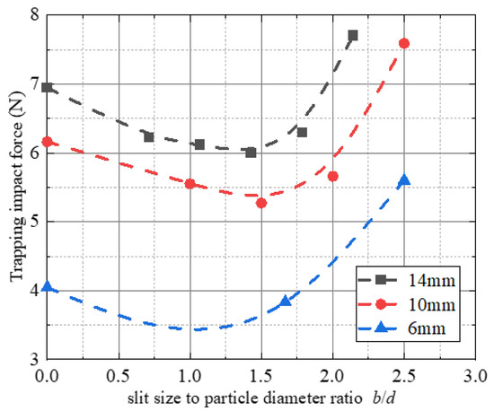 It can be seen from Figure 10 that with the width diameter ratio increasing from 0, the trapping impact force Ftrap of the three sized particles experience a process of first decreasing and then increasing; that is, the change in peak impact force Fmax is not linearly related to particle trapping efficiency E. There is an extreme value of b/d, which makes the inclined baffle rest in the ideal interception state. In Figure 10, the minimum value of the trapping impact force curve of 6 mm particles appears at about b/d = 1.0, while the minimum value of the trapping impact force curve of 10 mm and 14 mm particles appears at about 1 < b/d < 2. When b/d > 2, the decline rate of the trapping efficiency of the baffle to particles is much faster than the decline rate of the maximum impact force until the trapping efficiency is reduced to zero. This shows that when the particle size is in the range of 6~14 mm, the optimal width diameter ratio of the inclined baffle in the ideal interception state is 1 ≤ b/d ≤ 2.