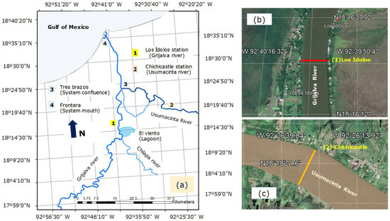 Location of Chichicastle #2 (Usumacinta) and Los Idolos # 1 (Grijalva) sampling stations. (a) Overall location, (b) los idolos cross section, (c) Chichicastle cross section.