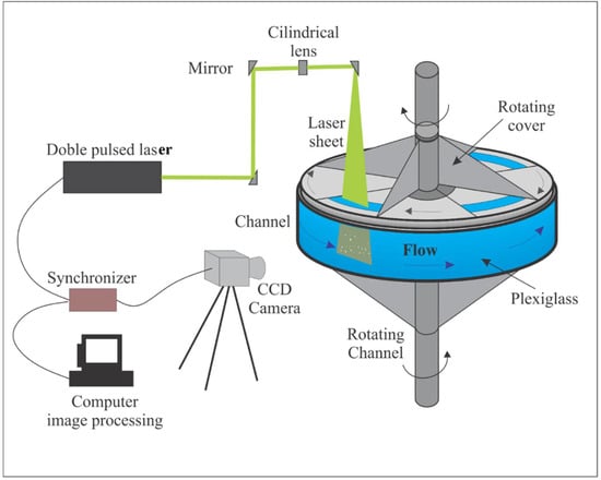 The Rotating Annular Flume (RAF) is made of Plexiglass and has a 1.5 m diameter and a flume cross section of 15 cm × 15 cm (Figure 2). The cohesive sediments were analyzed during 2 h long experiments and images were taken each 15 min. The Particle Tracking Velocimetry (PTV), using the algorithm developed by [7] was applied. This implies two procedures; the first one improves image quality through spatial filtering, and the second procedure is detecting particles in each pulse. A double pulsed Nd-Yag laser (New wave Research, Fremont, CA, USA) of 50 mW was used and recorded with Lumenera CCD cameras (Teledyne Lumenera Ottawa, Canada).
