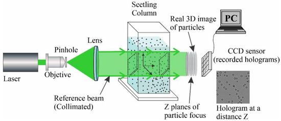 At the end of the experiments in the RAF, the aggregates are introduced in a settling column 1.0 m high and 3 cm × 7 cm cross-section, in order to obtain main flocs characteristics by means of an inline holographic system and DHPTV. In Figure 3, the main physical tools of an inline holographic system are shown. Comprising a Green light laser (B&W Tek Inc, Plainsboro Township, NJ, USA) of 532 nm of wave-length and 50 mW of power, an objective microscope 40×, a 10 μm pinhole in order to expand and filter the light shaft, a semispherical lens of 7 cm diameter and f = 75 mm, polarizing filters, digital camera CCD JAI CV-M2CL (JAI Ltd, Miyazaki, Japan) of 1600 × 1200 pixels spatial resolution and 7.4 µm per pixel and time resolution of 30 to 250 fps.