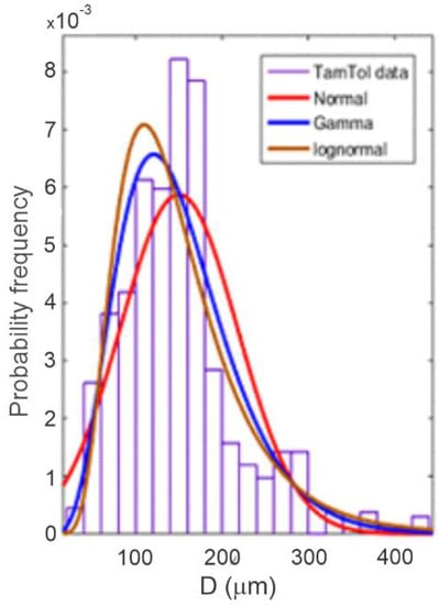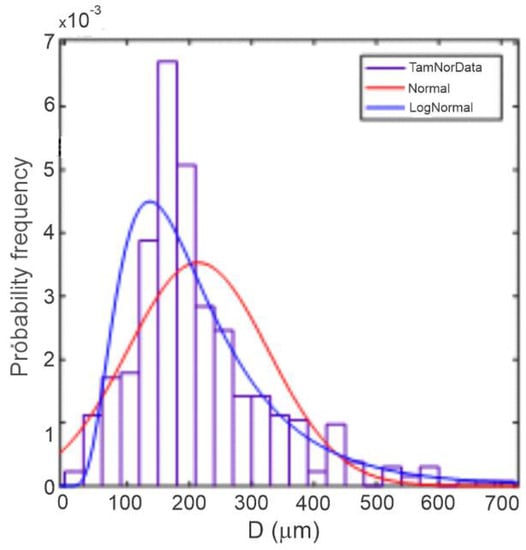 For this elapsed time, the sample consisted of 657 particles with diameters ranging from 39.2 to 514.1 μm, with an average value of 197.4 μm using a lognormal fit.