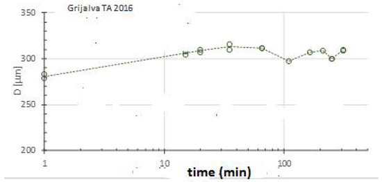 Time evolution of floc diameter in RAF experiments for the Grijalva river. Circles are experimental values and doted line the trend with time.