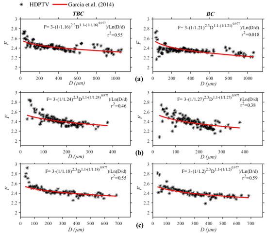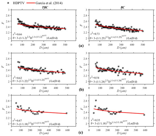 Best fit of the fractal dimension for the Grijalva River with Garcia Aragon et al. [16] model at different flocculation times using TBC and BC methods; (a) 30 min, (b) 45 min, (c) 60 min.