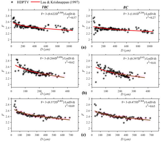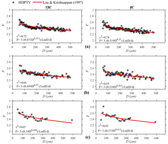 Best fit of the fractal dimension for the Usumacinta River with Lau and Krishnappan [15] model at different flocculation times using TBC and BC methods; (a) 30 min, (b) 45 min, (c) 60 min.