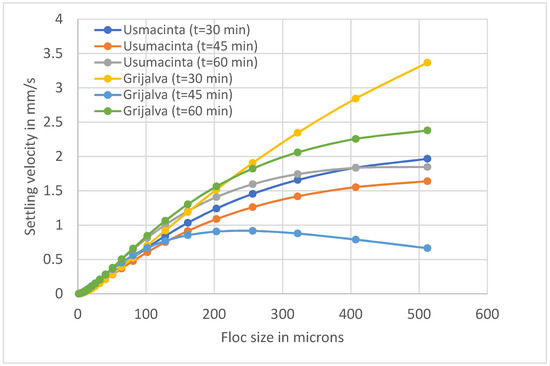 where is the settling velocity of the kth fraction of sediment and ν is the kinematic viscosity of water and g is the acceleration due to gravity. Applying Equation (7) to the flocs at various elapsed times, the settling velocity of sediments flocs from Usumacinta and Grijalva Rivers were calculated as shown in Figure 13.