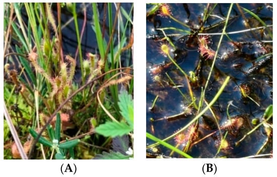 Sundews have a down-to-earth rosette of leaves covered with reddish glandular hairs. They are suited to attracting insects, then holding them in with sticky secretions and digesting them. Due to their rich composition of cyanogenic compounds, various organic acids, and proteolytic enzymes, in folk medicine, sundews were used to make medicinal tinctures applied as a diuretic, expectorant, and for eye inflammation [15]. It is their invaluable healing properties and changing habitat conditions that caused the rapid decline of the population, which in turn became the basis for the species’ protection.