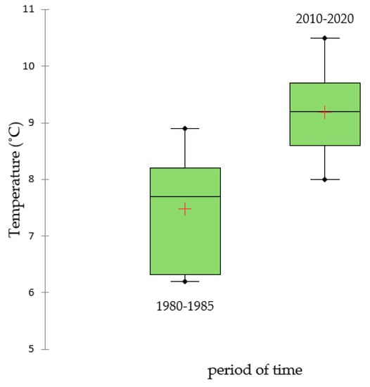 A two-factor ANOVA showed that the temperature was significantly different in the two analysed periods (Table 2, p < 0.05). Figure 2 revealed that the mean temperature in the period 1980–1985 was significantly lower than in the years 2010–2020. Rainfall showed no significant difference (Table 2, p > 0.05).