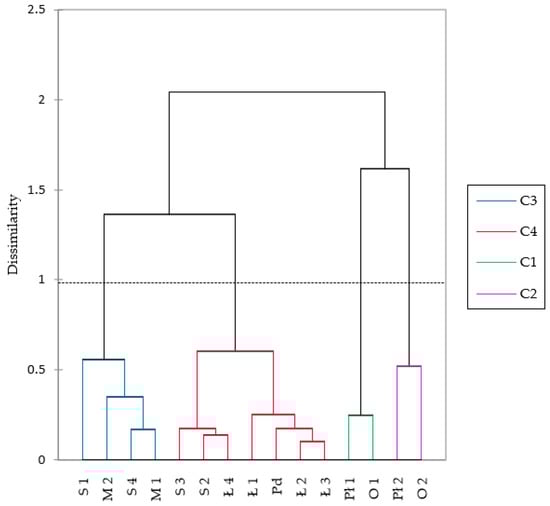 As a result of the AHC analysis, the data were divided into four groups (clusters). The dendrogram shows that sites Ł2 and Ł3 (value of BC = 0.0102), S2, and Ł4 (value of BC = 0.138), as well as S4 and M1 (value of BC = 0.172) are the most homogeneous in terms of vegetation. The greatest difference in the floristic composition is observed between the sites belonging to clusters C1 (marked in green) and C2 (marked in purple) (peat bogs near lakes). The former group consisted of sites located at the shoreline of the lakes, and the second group consisted of in-bog sites (Figure 4).