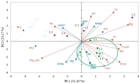 Based on the PCA analysis, a clear group of objects covering mid-forest peat bogs (ellipse) was designated (Figure 5). These stands are characterised by high values of Mg, N tot, P avail, Mn, and low content of organic substances. Moreover, Ctot, groundwater level (GWL), and air temperature above ground (ATAG) reached moderately high values.