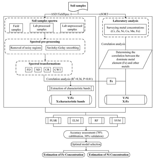 - Sun, W.; Zhang, X.; Sun, X.; Sun, Y.; Cen, Y. Predicting nickel concentration in soil using reflectance spectroscopy associated with organic matter and clay minerals. Geoderma 2018, 327, 25–35. [Google Scholar] [CrossRef]