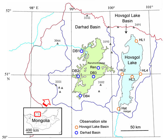 Location of observation sites in Hovsgol Lake Basin and Darhad Basin, northernmost Mongolia. The light blue area shows Hovsgol Lake, and the light blue lines represent the outflow river. The green area shows Darhad Basin drawn by the 1600 m height contour. The dark red line marks the border with Russia. The area bounded by dark blue lines and the border indicates the catchment area of each basin. The ∆ symbols are some of mountains above 3000 m in height with number of the height.