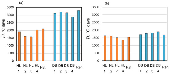 The basic temperature differences between the Hovsgol Lake Basin and Darhad Basin are shown in terms of integrated temperatures. To compare the degree of coldness and warmth from the temperature results observed from October 2006 to October 2007 at the five locations in each basin, the freezing index (FI) (Figure 2a) and thawing index (TI) (Figure 2b) were calculated from Equations (3) and (4), respectively [37]. The maximum FI for HL was 2106 °C·days for Hat (Hatgal), and the minimum was 1581 °C·days for HL3, while for DB the maximum was 3299 °C·days for Ren (Renchinlhumbe), and the minimum was 2891 °C·days for DB4. The mean value in HL was 59% of that in DB. The lowest HL, HL3, which is considered to be greatly influenced by lake water, was 50% of that in DB3. On the other hand, the maximum TI for HL was 1632 °C·days for HL1 and the minimum 1341 °C·days for HL4, while the maximum TI for DB was 1896 °C·days for DB4, and the minimum TI was 1683 °C·days for Ren. The average value of HL was 86% of that in DB, and in HL3 it was 84% of that in DB3. The result indicates that the presence of the lake water moderated winter temperatures in HL by approximately half compared to DB and made it cooler with less warmth in summer.