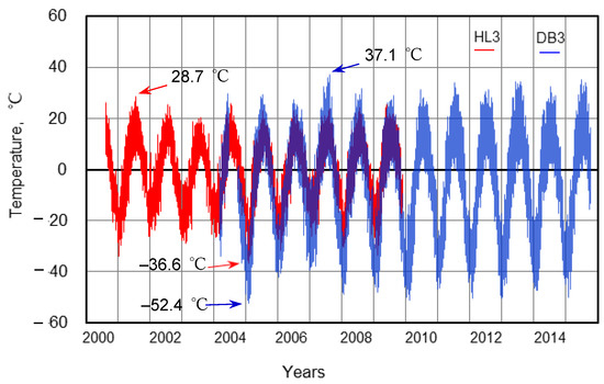 HL3 and DB3, located in the center of HL and DB, were representative of each basin. Long-term temperatures in the two basins are shown in Figure 3. Observations were made from 12 August 2000 to 28 November 2009 in HL3 and from 3 March 2004 to 7 October 2015 in DB3 and over a period of 5 years and 9 months from 3 March 2004 to 28 November 2009 in both basins. The measurements were conducted simultaneously. The annual maximum temperature during the observation period were 28.7 °C at 13:00 on 20 July 2001 in HL3 and 37.1 °C at 17:00 on 11 August 2007 in DB3. On the other hand, the annual minimum temperature was –36.6 °C at 10:00 on 26 January 2005 in HL3 and –52.4 °C at the same time in DB3, with DB3 being 15.8 °C lower than HL3. Overall, temperatures were lower in HL than in DB during summer and significantly higher in HL than in DB during winter. The correlation between temperatures between HL3 (island) and Hatgal (water level station) over a four-year period (30 August 2005–28 November 2009) was calculated.