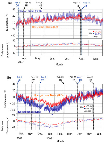 In order to identify the freeze–thaw period for lake water and the active layer, we compared meteorological data for the two basins: temperature changes observed in Lake Hovsgol basin HL3 and Darhad basin DB3 from 2007 to 2008 (Figure 4a,b) with H1–H5 and D1–D4 (Table 2). These are based on temperature analyses and observations related to the Hatgal and Renchinlhumbe weather stations.