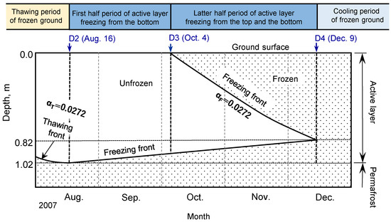 Finally, D4, the date of completion of freezing of the active layer, was determined as follows. The active layer freezes to a depth of 0.82 m from the top at D3, as described above, and considering that D1, D2, and D3 were determined separately and that the moisture state of the active layer does not change between the thawing and freezing processes (αF and αT in Equation (1) are equal), the latent heat of freezing of the active layer from D2 to D4 was calculated as described below in Section 3.4. The latent heat is equal to the latent heat of thawing expended in D1 to D2 (Table 3). Here, for convenience, we replace the latent heat with the integrated temperature. The integrated temperature TT from D1 to D2 spent thawing the frozen soil was 1419.2 °C-day, and the active layer thickness at D2 was 1.02 m. Equation (1) and αT = 0.0272 indicate that the TT required to freeze the active layer thickness of 0.82 m is 908.3 °C-day. Using αF = 0.0272 in Equation (1) to trace the date of occurrence of 908.3 °C-day after D3, D4, the date of completion of the freezing of the active layer, is 9 December.
