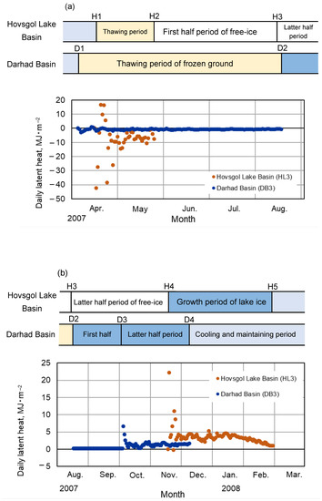 (a) Daily latent heat for lake ice or frozen ground in thawing process. Negative value is an adsorbed heat. (b) Daily latent heat for lake ice or active layer in freezing process. Positive value is a released heat.