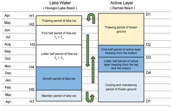 Schematic drawings of active layer on freeze–thaw processes and of seasonal division in Darhad Basin.