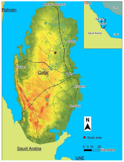 Qatar is located in the eastern part of the Arabian Peninsula (Figure 1) and has an area of around 11,500 km2. It is surrounded by the Arabian Gulf from all directions except the south, where it shares a land border with Saudi Arabia. The country is very arid due to low rainfall, and is characterized by relatively low relief, with a maximum height of 103 m above mean sea level at Qurain Abu al-Bawl. The topography is characterized by land depressions formed due to salt dissolution/collapse and karstification. Soil cover is generally very poor due to arid conditions and the lack of clastic input since the last glacial maximum, except for land depressions where loamy soil is accumulated by runoff.