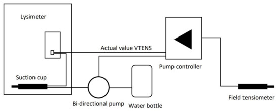 Figure 2 shows a schematic representation of how the lysimeter works. All probes were connected through a distribution box, which was directly mounted at the lysimeter. Further to this, a pressure sensor tested the value of the virtual tensiometer (VTENS), which represents the controlled boundary condition at the lowest part of the lysimeter cylinder. The VTENS provided a 4th matrix potential value just above the bottom of the cylinder. To maintain equivalent field conditions inside the cylinder, the smart field lysimeter used a feedback control by the means of a T8 reference tensiometer, which was placed into the soil close to the lysimeter. This feedback control represents the primary advantage of smart field lysimeters over conventional systems, as it enables soil humidity, water flux, and potential inside the lysimeter to be matched to ambient conditions. Both the lysimeter and the water bottles sat on separate scales which provided continuous readings. A continuous change in the VTENS value was automatically undertaken with the T8 reference tensiometer through a bi-directional pump that could pump water to or from a drainage water bottle located inside the field box (Figure 2).