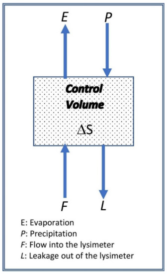 A schematic representation of a control volume representing the lysimeter is displayed in Figure 3. Inflow into the lysimeter occurred through precipitation (P) and flow from the water tank (F). The latter is the component that mimics the field conditions by pumping water into the lysimeter through the T8 tensiometer. L is the outflow component of the T8 tensiometer, which is revealed via leakage out of the lysimeter. The last outflow component is evaporation (E). The difference between inflow and outflow equals the change in soil moisture content (ΔS), corresponding to the change in the lysimeter’s weight.