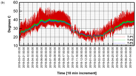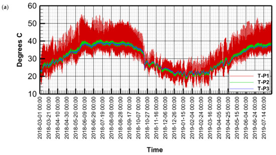 The upper probe (T-P1) shows high fluctuation, as it is closer to the ambient air temperature, whereas temperatures at the lower probe were stable. The highest recorded temperature at the upper probe (T-P1) was 55.1 °C, which was recorded around noontime on the 2 June 2018, and 12 July 2018. The lowest recorded temperature at the upper probe was 13.4 °C, which was recorded in the early hours of the morning on the 23 January 2019 and the 7 February 2019. The minimum temperature at the probe T-P2 was 18.3 °C, which was recorded on 22 January 2019, and the maximum was 41.10 °C, which was recorded on the 13 July 2018. The minimum temperature at T-P3 was 19.40 °C, which was recorded on 23 of January, and the maximum temperature was 39.40 °C, which was recorded on 13 July 2018. Despite the high variability of temperature, the average values were 31.97 °C, 30.82 °C, and 30.78 °C for T-P1, T-P2, and T-P3, respectively.