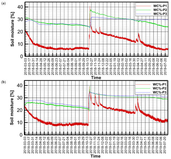 The volumetric soil moisture values (in %) are presented in Figure 5 for lysimeters 1 and 2. Several rainfall events occurred in October and April 2019, which appear as spikes in the soil moisture time series of the shallow probe (P1), whereas the deeper probes show a slower response to rainfall.