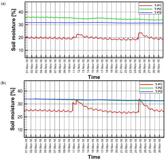 Soil moisture during November 2018 for lysimeter 1 (a) and lysimeter 2 (b).