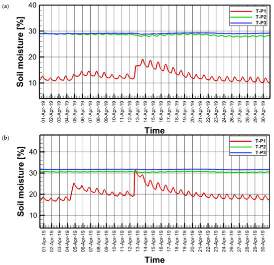 Soil moisture during April 2019 for lysimeter 1 (a) and lysimeter 2 (b).