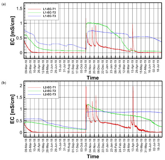 Figure 8 shows the bulk EC in the soil at T1 (5 cm), T2 (35 cm), and T3 (55 cm) for both lysimeter 1 and lysimeter 2 at 10-min increments from March 2018 to July 2019, showing a high degree of correlation with soil moisture (Figure 5). The correlation factor between soil moisture and EC varied between 0.88 to 0.93, dependent upon the depth. Costa et al. [29] found that the ideal time to measure EC was during periods of high soil moisture content.