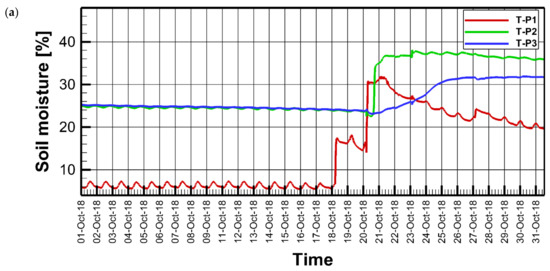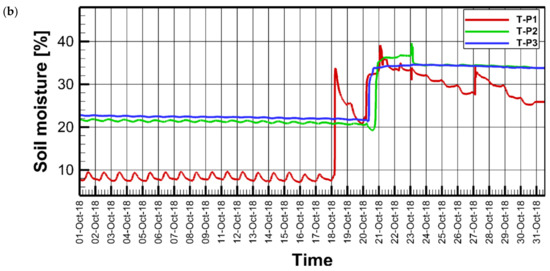 Soil moisture during October 2018 for lysimeter 1 (a) and lysimeter 2 (b).