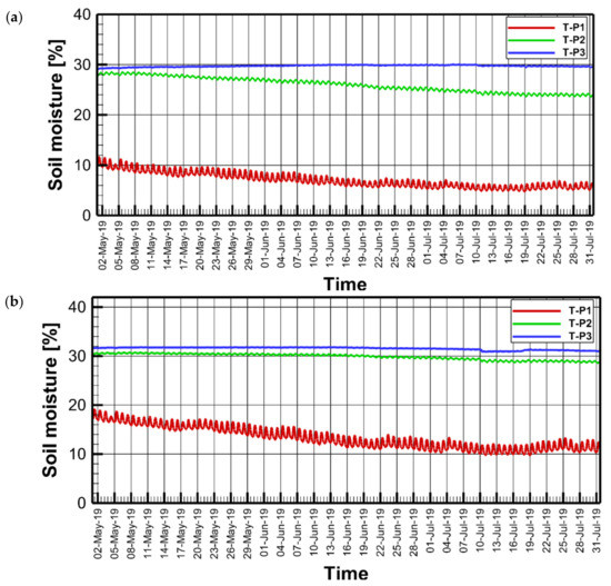 Soil moisture during May–July 2019 for lysimeter 1 (a) and lysimeter 2 (b).