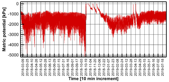 The soil matric potential (SMP) is indicative of the cohesive force between soil particles and water molecules in the pore space of the unsaturated zone. Hence, it represents the force of attraction or tension between water molecules and soil. It provides an indication of the ease at which plants can uptake water from the soil, and is arguably the most important criteria for irrigation design [32,33,34]. The higher the SMP, the more difficult it will be for plants to receive water from the soil. The SMP differs from soil moisture in the sense that the latter shows how much water is available in the soil, whereas the SMP represents the availability of water for plant growth. The SMP was measured at three locations in each lysimeter, namely at 50 mm, 350 mm, and 550 mm depths from the ground surface level. Because the top layer of soil was the most critical for plant germination and growth, we present data from the first probe. Figure 11 shows the SMP for the upper soil layer for the period between March 2018 and July 2019. The SMP varied between zero when the soil was fully saturated to around −5000 kPa when it was very dry. In such instances, negative values indicate suction. The SMP rose to 0 rapidly after rainfall and slowly dropped thereafter. After the first rain in the season (18th of October), the SMP rose to near-zero conditions when rainfall occurred, falling to −100 kPa over the course of a few hours. On the 20th of October, after the major storm described in Section 3.4, the soil matric potential remained close to zero for over 20 days. Similar behavior occurred in November after rainfall. The SMP after rainfall during April was around −280 kPa, which was sufficient for plants to uptake water. For this soil, field capacity (FC) occurred when the SMP was ~−33 kPa. For loamy soils (i.e., the soil types examined by this study), the field capacity was about 35% of volumetric soil moisture. The SMP of −1500 kPa marked the permanent wilting point (WP); if no water was available, all plants would die. This occurred when the volumetric soil moisture ranged between 10% and 15% in the loamy soils. Obtaining the SMP was critical for irrigation management and water conservation, especially in arid zones where the water balance was highly tenuous in the context of plant germination and growth.