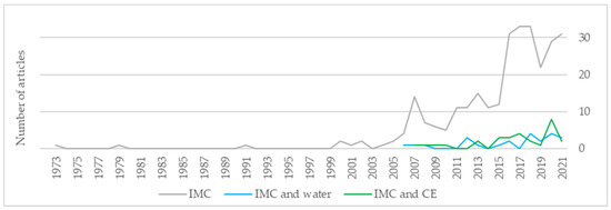The evolution of publications under the three databases of the study (IMC, IMC and water, and IMC and CE) is shown in Figure 1. IMC is not a new topic; the first publication goes back to 1973. However, it has gained attention dramatically since 2006. Publications on IMC and water, and IMC and CE, on the other hand, are about to develop and have not increased considerably, indicating that there is plenty of room to explore and learn on these topics.