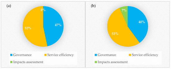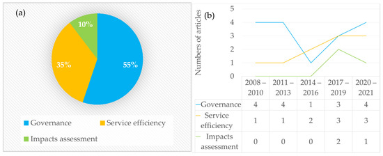 The most cited articles on IMC are concerned with two dimensions: first, service efficiency (53%); second, governance (47%) (Figure 2a). However, in the most recent articles, this ratio is a little different. The latest are dominated by service efficiency (53%), followed by governance (40%) (see Figure 2b). In addition, seven per cent of the articles are devoted to impacts assessment, emphasising the growth of the new emerging topic in the literature.