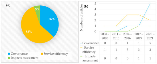 Articles crossing IMC and CE reveal a dominancy of service efficiency (58%), followed by governance (37%), and impacts assessment (5%) (Figure 4a), highlighting the importance of cost efficiency and fiscal concerns, in articles crossing IMC and CE. Nonetheless, 5% of studies are on impacts assessment. However, the number of publications regarding this dimension is growing, particularly after 2017 (Figure 4b). Unlike IMC and water, most studies on IMC and CE (13 articles) conducted a quantitative research method by applying several models, including order-m panel data, regression analysis, an F-test, the Ramsey-RESET test, the White test, and the Shapiro–Wilk test. There are just two qualitative and three mixed research methods studies within this database.