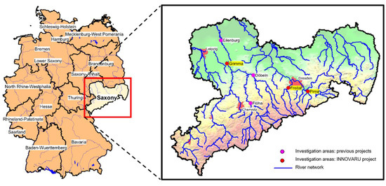 To this end, towns in the Free State of Saxony were taken as case studies, and different flooding parameters (i.e., inundation level and flow velocities) describe the events that occurred. Figure 1 displays the location of the investigated areas, and Table 1 provides an overview with respect to the inspected buildings per study area. Existing buildings in the Saxonian towns of Döbeln, Eilenburg, Grimma and Flöha affected by the 2002 flood were systematically investigated in previous research projects and formed the basis for the validation of the previous EDAC flood damage model with respect to real observed damage [9,10,18,28]. In addition to the relevant building parameters, the existing flood marks were also documented during building inspections. The towns of Pirna, Grimma and Freital were selected as study areas for joint investigations with INNOVARU project partners.