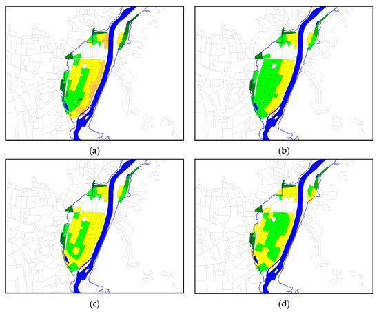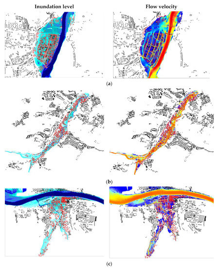 The INNOVARU project comprises the reinterpretation of the 2002 flood event in the investigation area of Freital (Figure 4b). Two-dimensional (2D) unsteady-flow modeling was performed. Flow hydrographs of the tributaries “Rote Weisseritz” and “Wilde Weisseritz” were analyzed by rainfall–runoff models. Manning’s values were calibrated considering the observed flood line of the 2002 flood. Interestingly the maximum inundation level and maximum flow velocity are not simultaneous as a result of the unsteady flow. Discharge conditions at the maximum inundation level were selected for further analysis of flood damage.
