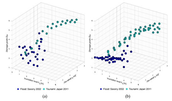 For approximately 1200 damage cases, flow velocities were assigned based on hydraulic calculations (see Section 2.3) in four of the selected investigation areas in Saxony [18]. The value for the assigned flow velocities was vmax ≈ 2.5 m/s, which corresponds to moderate water movement typical of river floods. Data on damage cases caused by higher flow velocities (such as those that occur with flash floods) were not available. Therefore, an unconventional but innovative approach had to be implemented in the INNOVARU project. The damage data of the 2011 Tohoku earthquake tsunami were included, assuming that tsunamis represent an extreme form of (cyclic) flooding.