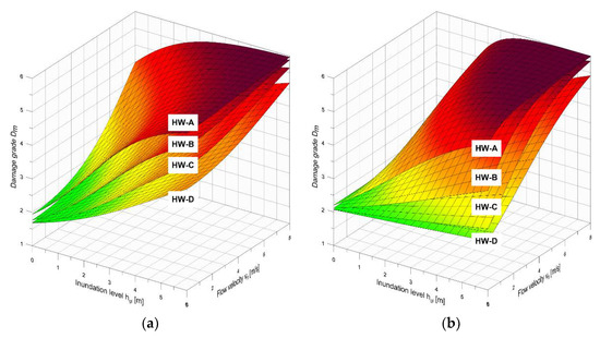 The flood vulnerability classes were determined according to the method described in [10]. Evaluation of the damage cases in the EDAC flood damage database reveals significant differences in the mean damage grades (Dm) for the various main building types depending on the impact (inundation) level. Owing to these differences, damageability levels could be defined that are assumed to be typical for the vulnerability classes HW-A to HW-D. New or previously unclassified construction methods are classified based on their mean damage grades (Dm) for the corresponding impact level [10].