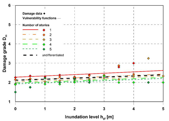 Data on building damage sustained during the 2011 Tohoku earthquake tsunami were collected in a comprehensive damage database (n ≈ 252.000) and are available in an aggregated form [19]. So-called “fragility functions” were derived in [20,21] from this damage data depending on the inundation level (h) and building type for damage prognosis due to tsunami impact. Based on the concept of damage grades for earthquakes according to the European Macroseismic Scale (1998-EMS-98) [22], a six-stage damage scale for tsunamis was introduced for these investigations.
