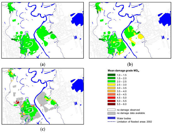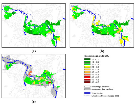 The affected buildings on the northeastern bank of the Elbe remain unconsidered. Therefore, the number of SAB damage cases for Pirna apparently exceeds the number of residential buildings in Table 1.