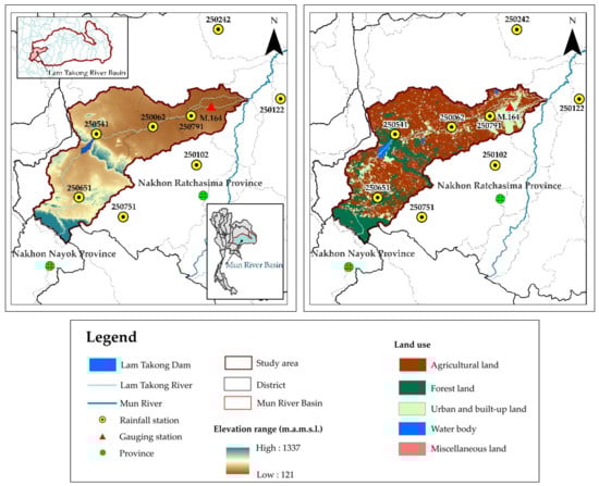 The Lam Takong River Basin, which originates from the Dong Phaya Yen Range and divides the river basins of Mun, Pasak, and Nakhon Nayok, is a tributary located in the west of the Mun River Basin. The drainage area is about 3295 km2 (5% of the entire Mun River Basin), covering the areas of Mueang District of Nakhon Nayok Province and Nakhon Ratchasima Province for the districts of Kham Thale So, Chaloem Phra Kiat, Pak Thong Chai, Pak Chong, Mueang, Sikhio, and Sung Noen. The Lam Takong River is the main river of the Lam Takong River Basin and it flows approximately 220 km from its source to its confluence with the Mun River at Tha Chang Sub-district in Chaloem Phra Kiat District, Nakhon Ratchasima Province. The Lam Takong Dam, which is the largest earthen dam in the Lam Takong River Basin with a storage capacity of 314.5 million m3, is the main water source for 24,671.2 hectares of irrigated area, domestic consumption in Nakhon Ratchasima Province, and hydropower generation operated by the Electricity Generating Authority of Thailand (Provincial Office of Natural Resources and Environment Nakhon Ratchasima, 2020 [11]) (see Figure 1). The topography of the Lam Takong River Basin is steep at the upstream, especially the upper part of the Lam Takong Dam, while the terrain downstream is flat. The climate of the Lam Takong River Basin is under the influence of the southwest and northeast monsoons. There are three kinds of seasons that exist in the area, i.e., dry (mid-February to mid-May), rainy (mid-May to mid-October), and winter seasons (mid-October to next February). According to the information from the Provincial Office of Natural Resources and Environment Nakhon Ratchasima (2020) [11], the annual average rainfall is about 1200.4 mm, of which 976.7 mm and 223.7 mm are recorded in the rainy and dry seasons, respectively. The annual average runoff is estimated to be 467.5 million m3, while the average runoff can reach 359.6 million m3 and 107.9 million m3 in the rainy and dry seasons, respectively. Based on the meteorological records of the historical years, the annual average temperature is about 25.4 °C. Lastly, based on the Soil Service Repository of the Land Development Department (2017) [23], there are five main land use types, namely, agriculture (59.7%), forest (17.6%), urban and built-up (15.3%), water body (2.1%), and miscellaneous (5.3%).