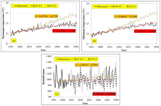 Projected average annual maximum and minimum temperature (a,b) and projected average annual rainfall (c) under RCPs 4.5 and 8.5 until the end of the century in the Lam Takong River Basin.