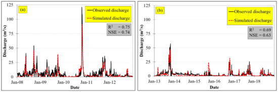 - Calibration and validation of the SWAT at daily time steps was undertaken, in which a systematic modification of the most sensitive model parameters was made to match simulated outputs with observed historical discharge data at the M.164 gauging station during 2008–2012 and 2013–2018 for calibration and validation, respectively (note: a long time series of observations was unavailable because the installation of gauge and monitoring process started later in April 2007). In this study, the correlation coefficient (R2) and the Nash–Sutcliffe Efficiency coefficient (NSE) were used to evaluate the goodness-of-fit plots. As suggested by Santhi et al. (2001) [27] and Moriasi et al. (2007) [28], the SWAT model performance is judged as satisfactory and reliable when R2 and NSE values are greater than 0.6 and 0.5, respectively, which imply that the model simulation results are reliable and could be used for further simulations.