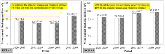 To meet increased future water demand, the 2019 water resources management and development plan, which was mainly related to sediment dredging of the Lam Takong Reservoir, was proposed. The reservoir capacity was increased by 10 million m3 to reach 324 million m3 (Royal Irrigation Department, 2017 [25]). The hydrological response (i.e., mean annual discharge) to the aforementioned plan and different climate and land use change scenarios was simulated by SWAT. Under all combined scenarios compared to the baseline condition (2008–2018), the model results showed a slight increase in mean annual discharge at the M.164 gauging station. This is due to a relatively small increase in reservoir storage capacity by 3.2%, as well as in future rainfall (see Section 3.1.1). The results for both RCPs 4.5 and 8.5 showed a similar tendency with an increase in mean annual discharge for all future time horizons, in which the increase under RCP 8.5 was relatively higher than that of RCP 4.5. Correspondingly, the maximum increases of 1.2 million m3 and 1.4 million m3 were projected under RCPs 4.5 and 8.5 in the 2040–2059 and 2060–2079 periods, respectively, while the minimum increase was expected to be 0.1 million m3 under RCP 4.5 during 2060–2079 (see Figure 4). These results are in line with the study of Singkran et al. (2015) [41], which stated that the influences of land use and climate changes on both projected yield and flow of water over the 56-year period (2010–2065) in the Lam Takong River Basin were noticeable compared to those obtained from the baseline hydrologic SWAT model (2001–2009). Moreover, Kosa and Sukwimolseree (2014) [42] depicted that based on the 2008 land use map and the daily weather data from 1979 to 2010, the climate change is a main parameter that affects surface runoff, as calculated by SWAT in the Upper Mun River Basin where the Lam Takong River Basin is located. Sukwimolseree and Kosa (2019) [43] also highlighted that the SWAT calculated average runoff in the Mun River Basin has a direct variation with rainfall from 1981 to 2010 and urban expansion on agricultural land within 5, 10, and 15 km from the urban agglomeration based on the 2008 land use data using GIS.